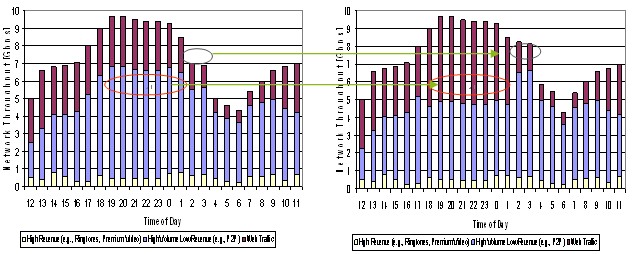 合理調(diào)配資源是指應(yīng)用智能管道技術(shù),并結(jié)合激勵(lì)型市場(chǎng)定價(jià),運(yùn)營(yíng)商能夠減少網(wǎng)絡(luò)空載時(shí)間或降低低載率,在網(wǎng)絡(luò)忙時(shí)留出更多的資源給高付費(fèi)用戶和業(yè)務(wù),從而在相同的資源下獲得更高的收益。下圖是某運(yùn)營(yíng)商引入智能管道前后的數(shù)據(jù)分布效果圖,忙時(shí)高付費(fèi)業(yè)務(wù)增加,非忙時(shí)總業(yè)務(wù)量增加(主要來自于低付費(fèi)業(yè)務(wù)),這些都為運(yùn)營(yíng)商帶來了額外的收入。實(shí)際增收效果會(huì)因智能管道策略的力度和動(dòng)態(tài)調(diào)整的效果而有不同,通常都會(huì)增加幾個(gè)百分點(diǎn)甚至更高。