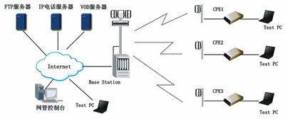 上文介紹的主要測試領(lǐng)域側(cè)重實(shí)驗(yàn)室環(huán)境,運(yùn)營商在對設(shè)備經(jīng)過一定程度上的實(shí)驗(yàn)室測試后,一般會進(jìn)一步進(jìn)行外場測試。在外場測試中,覆蓋、容量、多終端下的QoS保證、移動(dòng)性、長時(shí)傳輸能力等方面將成為重點(diǎn)的測試內(nèi)容,下面就針對固定WiMAX技術(shù),對其部分外場測試內(nèi)容進(jìn)行介紹(典型外場測試框圖參考圖3)。