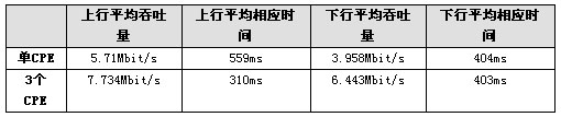 下面給出單扇區(qū)范圍內(nèi),在64QAM調(diào)制格式的工作方式下,單個(gè)CPE工作和三個(gè)CPE同時(shí)工作時(shí)的吞吐量和響應(yīng)時(shí)間的典型測試結(jié)果,業(yè)務(wù)類型均為BE。