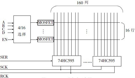 本系統(tǒng)采用行掃描方式,行選通電路由集成電路74HC154構成。74HC154是4線-16線高性能譯碼器,在點陣屏幕不大的情況下,一般的單片機可以直接驅(qū)動點陣LED的亮滅,但是考慮擴展為大屏幕尺寸時,因單片機的I/O口不足以提供足夠的驅(qū)動電流,但可在74HC154和點陣的行接口接上一個PNP型8550三極管開關電路用來提供足夠的電流,當74HC154發(fā)出低電平時,三極管Q導通,輸出高電平。此外,可用帶有2級鎖存移位輸出功能的74HC595鎖存器來對列線進行驅(qū)動控制。LED點陣的列線接到74HC595的8bit并行輸出口上,由單片機控制數(shù)據(jù)的輸出,利用74HC595的鎖存輸出功能,電路共用同一個移位時鐘SCK和數(shù)據(jù)鎖存時鐘RCK,可級聯(lián)多片74HC595以構成更大LED點陣屏的列驅(qū)動電路。此結(jié)構還可在75HC595的使能端通過PWM波進行灰度調(diào)節(jié)。以一個16行×160列的LED點陣單元為例,本系統(tǒng)采用的驅(qū)動電路原理如圖所示。