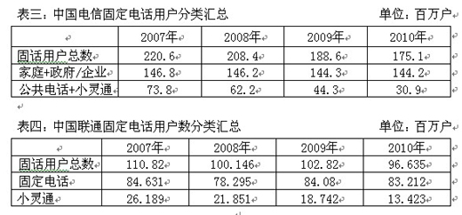 從表中可以看出,中國電信每年的固定電話用戶總數(shù)持續(xù)下降,下降速度最快的是小靈通業(yè)務(wù),剔除小靈通和公共電話業(yè)務(wù),中國電信的固定電話用戶量實際上一直穩(wěn)定在1.4億戶以上,中國聯(lián)通公司的固定電話用戶量則一直穩(wěn)定在8000萬戶以上。