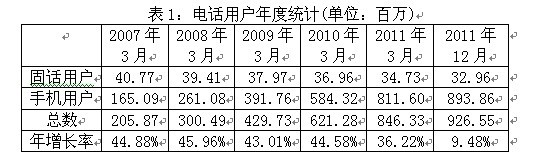 政府對(duì)電信市場(chǎng)的開(kāi)放不僅帶來(lái)了電信產(chǎn)業(yè)的快速發(fā)展,激烈的競(jìng)爭(zhēng)也令消費(fèi)者享受到性價(jià)比更高的服務(wù)。近幾年,電話用戶總數(shù)持續(xù)增長(zhǎng),從1999年的2281萬(wàn)增加到2011年3月底的8億4633萬(wàn)。截至2011年12月31日,電話用戶總數(shù)達(dá)到9億2655萬(wàn),說(shuō)明從2011年4-12月期間新增用戶8022萬(wàn)。其中,手機(jī)用戶數(shù)增長(zhǎng)最為顯著,從2007年的1億6509萬(wàn)增加到2011年3月的8億1160萬(wàn),2011年12月底達(dá)到8億9386萬(wàn)。但是,固話用戶的數(shù)量則從2007年的4077萬(wàn)減少到2011年3月的3473萬(wàn),到2011年12月僅有3269萬(wàn)。(見(jiàn)表1)