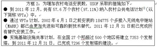 農(nóng)村電話安裝數(shù)從2007年3月的4710萬(wàn)增加到2011年3月的2億8229萬(wàn),2011年12月達(dá)到3億1539萬(wàn)。農(nóng)村電話數(shù)占全國(guó)電話總數(shù)的比例也從2007年的22.88%增加到2011年12月的34.04%。移動(dòng)電話數(shù)量對(duì)農(nóng)村電話總數(shù)的增加貢獻(xiàn)很大。移動(dòng)電話在農(nóng)村電話總數(shù)中的比重從2007年3月的73.33%提高到2011年3月的96.90%,到2011年12月達(dá)到97.53%。2011-2012年(到12月)期間,農(nóng)村電話數(shù)量的增長(zhǎng)率為11.73%,而城市電話用戶增長(zhǎng)率則為8.35%。個(gè)人用戶是農(nóng)村電話數(shù)增加的主要推動(dòng)力,個(gè)人用戶占農(nóng)村電話總數(shù)的比重從2007年的51.87%上升到2011年2月的86.78%。為了增加農(nóng)村電話安裝總數(shù),USOF采取了以下措施,請(qǐng)見(jiàn)方框2所示。