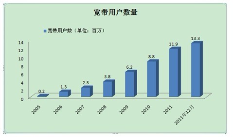 去年進(jìn)行的3G/BWA牌照拍賣(mài)有望成為一個(gè)催化劑,將寬帶接入擴(kuò)展到印度最偏遠(yuǎn)的地方。印度電信市場(chǎng)正在經(jīng)歷“信息革命”。為了促進(jìn)寬帶的普及,政府已經(jīng)公布并實(shí)施了多項(xiàng)政策(見(jiàn)方框3)。得益于這些政策的實(shí)施,寬帶用戶數(shù)從2005年的18萬(wàn)增加到2011年3月的1187萬(wàn),2011年底達(dá)到1330萬(wàn)。