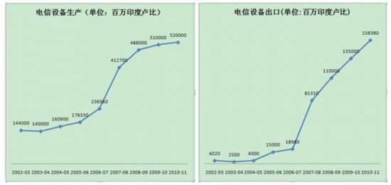 印度并不滿足于僅成為制造業(yè)中心,還計(jì)劃擴(kuò)大出口。2006-2007年,印度電信設(shè)備出口總價(jià)值約為189.8億盧比,到2010-2011年,這一數(shù)字增加到1583.8億,增長(zhǎng)了730%。