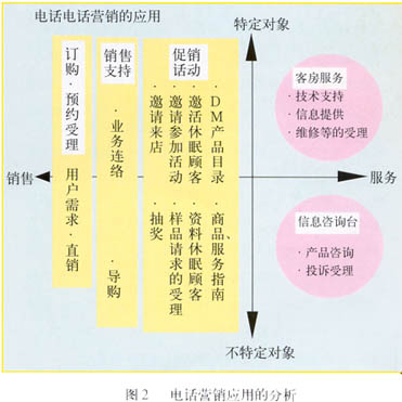 ——圖2表示以電話營(yíng)銷的目的及對(duì)象為軸分析電話營(yíng)銷的應(yīng)用。縱軸為對(duì)象,分為“特定”和“不特定”,橫軸為目的,分為“服務(wù)”和“銷售”。這樣右上區(qū)域=“特定對(duì)象X服務(wù)”,即為客戶服務(wù),右下區(qū)域=“不特定對(duì)象X服務(wù)”,對(duì)應(yīng)信息咨詢;左側(cè)為銷售。從對(duì)象來看,服務(wù)更偏重于“特定對(duì)象”。從目的來看,訂購/預(yù)約受理是最直接的銷售行為,所以放在最左,銷售支持在中間,促銷活動(dòng)靠右。
