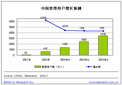 進(jìn)入2003年下半年,幾乎所有人都可以明確地感受到中國寬帶市場(chǎng)的不斷升溫。中國電信、中國網(wǎng)通這兩大運(yùn)營商以爭奪寬帶用戶、擴(kuò)大市場(chǎng)占有率為目標(biāo)的價(jià)格戰(zhàn)全面打響,并且日趨白熱化。寬帶接入的價(jià)格門檻以令人難以置信的速度不斷下調(diào)。與此同時(shí),寬帶用戶的數(shù)量則呈現(xiàn)雪崩式激增,一條以寬帶運(yùn)營商為龍頭,涵蓋軟件提供商、互聯(lián)網(wǎng)內(nèi)容服務(wù)商、計(jì)算機(jī)生產(chǎn)商、設(shè)備制造商等在內(nèi)的寬帶產(chǎn)業(yè)鏈正在迅速形成,并且不斷壯大。中國的寬帶市場(chǎng)進(jìn)入前所未有的繁榮期。