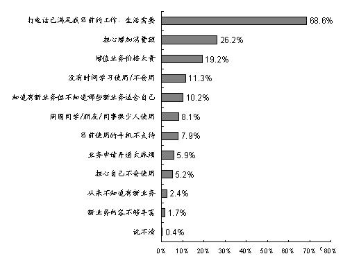 調(diào)查發(fā)現(xiàn),目前制約手機用戶使用更多數(shù)據(jù)增值業(yè)務(wù)的原因主要是:“打電話已經(jīng)滿足目前的工作/生活需要”(占68.6%)、“擔心增加消費額”(占26.2%)、“增值業(yè)務(wù)價格太貴” (占19.2%)、“沒有時間學(xué)習(xí)使用/不會用”(占11.3%)、“知道有新業(yè)務(wù)但不知道哪些新業(yè)務(wù)適合自己”(占10.2%)等。