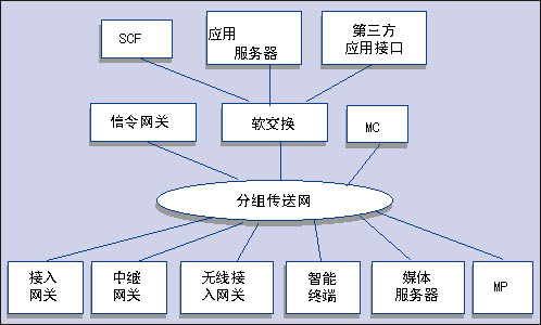 接入層包括各種接入網關、中繼網關、無線接入網關、智能終端以及與處理媒體有關的媒體服務器和多點處理器(MP)。傳送層包括提供IP包轉發(fā)的各種承載網功能實體?刂茖邮荖GN網絡的核心,主要包括軟交換設備、信令網關和多點處理器。業(yè)務層則主要包括應用服務器、第三方應用接口和傳統(tǒng)智能網功能。該業(yè)務層通過開放的業(yè)務層接口向用戶提供傳統(tǒng)智能網業(yè)務、多樣化的第三方業(yè)務和增值業(yè)務。
