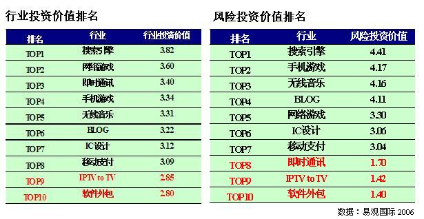 搜索引擎行業(yè)投資潛力最大,無(wú)論是行業(yè)投資價(jià)值還是風(fēng)險(xiǎn)投資價(jià)值均名列第一。網(wǎng)絡(luò)游戲行業(yè)兩方面投資潛力均具備,但由于行業(yè)面臨整合,致使風(fēng)險(xiǎn)投資價(jià)值略遜。隨著