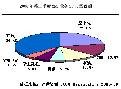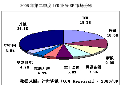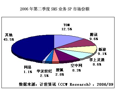 計(jì)世資訊(CCW Research)調(diào)研顯示。2006年第二季度,中國(guó)SMS業(yè)務(wù)市場(chǎng)規(guī)模達(dá)到118.3億元人民幣,其中SP收入12.1億元人民幣。TOM、騰訊和新浪排名前三位,分別占12.5%、9.6%和9.1%。其次為掌上靈通和空中網(wǎng),占8.6%和8.3%。