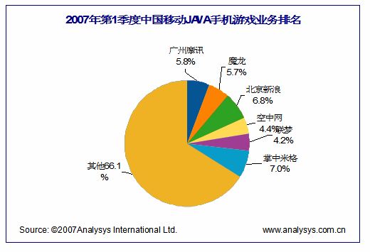 從企業(yè)實(shí)力和市場(chǎng)份額來看,目前手機(jī)游戲市場(chǎng)主要有三股力量組成,以空中等為代表的全業(yè)務(wù)線電信增值服務(wù)商(SP),以新浪等為代表的互聯(lián)網(wǎng)門戶綜合服務(wù)商,以米格、魔龍為代表的專業(yè)手機(jī)游戲產(chǎn)品與服務(wù)提供商(SP)。根據(jù)中國(guó)移動(dòng)“百寶箱”第1季度收入數(shù)據(jù),易觀注意到,掌中米格、北京新浪、廣州摩訊位列前三,前三名占據(jù)了近20%的市場(chǎng)份額。夢(mèng)網(wǎng)手機(jī)游戲精品業(yè)務(wù)的三家服務(wù)提供商第一季度收入排名為:米格、新浪、空中網(wǎng)!