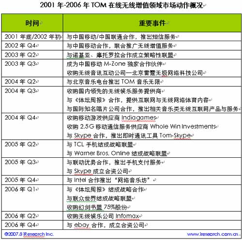 2000年中,TOM在線正式推出,這家一開始便以無線增值為特色的企業(yè)符合了當(dāng)時(shí)中國(guó)互聯(lián)網(wǎng)市場(chǎng)的環(huán)境,那時(shí)無線增值業(yè)務(wù)如火如荼,第五媒體的概念呼之欲出。隨后,便開始了與各大無線媒體、傳統(tǒng)媒體等一系列的合作和收購,所涉及的領(lǐng)域涵蓋短信、無線音樂、手機(jī)游戲、手機(jī)支付、手機(jī)體育新聞、即時(shí)通訊等許多行業(yè),一個(gè)龐大的無線媒體帝國(guó)看似已經(jīng)牢不可破。直到,2006年第四季度與ebay易趣合并,開始涉足電子商務(wù)。