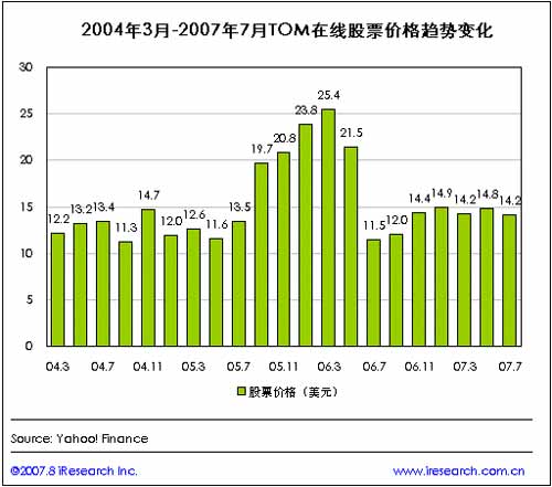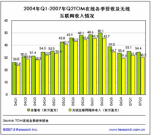 在2006年第二季度總營(yíng)收以及無線互聯(lián)網(wǎng)服務(wù)收入分別達(dá)到歷史最高點(diǎn)(分別達(dá)到5010萬美元和4571萬美元)之后,TOM在線各季收入及無線互聯(lián)網(wǎng)收入呈逐季下滑趨勢(shì),至2007年第二季度,TOM在線的總營(yíng)收為3439萬美元,來自無線互聯(lián)網(wǎng)服務(wù)的收入為3024萬美元。