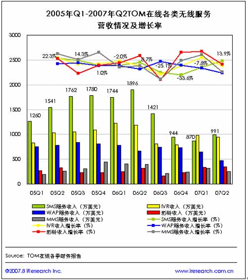 隨后,各無線服務(wù)收入則基本處于下滑趨勢(shì),在2007年第二季度,除短信服務(wù)收入達(dá)到991萬美元,較上一季度增長(zhǎng)13.9%之外,MMS收入僅246萬美元,環(huán)比減少23.1%,WAP服務(wù)收入為471萬美元,環(huán)比減少27.3%。
