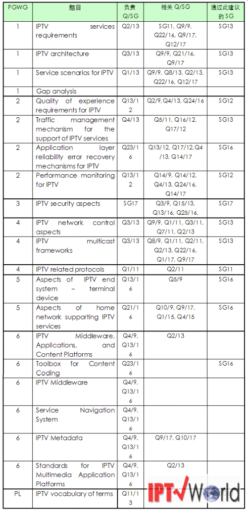 表2:FG IPTV輸出的工作文檔以及負責(zé)此文檔后續(xù)工作的ITU-T研究組