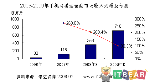 諾達咨詢報告《2008手機網(wǎng)游報告—產(chǎn)業(yè)發(fā)展與競爭策略》認為,手機網(wǎng)絡(luò)游戲已經(jīng)過了市場導入期,在未來幾年將步入快速發(fā)展階段。咨詢研究數(shù)據(jù)表明,2007年手機網(wǎng)游市場運營收入達到了1.18億元人民幣,今年將達3.58億元人民幣,到2009年市場規(guī)模有望突破7.0億元人民幣。