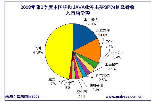 易觀國際近期發(fā)布《2008年第2季度中國手機(jī)游戲市場季度監(jiān)測》顯示:中國移動(dòng)JAVA業(yè)務(wù)SP信息費(fèi)方面,掌中米格、北京新浪分居前兩名,兩者市場占有率已提高至31.9%。其中掌中米格信息費(fèi)季度收入達(dá)到2505.86萬元,市場占比為17.3%,而新浪信息費(fèi)收入市場占比為14.6%。信息費(fèi)收入的第3至第5名依次為TOM、com2us、掌尚星空,三者總市場占比為9.7%。