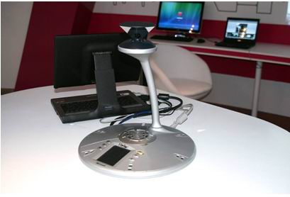 在耐心聽(tīng)完介紹后,禁不住誘惑,我便親自做了現(xiàn)場(chǎng)體驗(yàn),原來(lái)這套系統(tǒng)所使用的360o攝像頭不同于一般的攝像頭,它集4個(gè)攝像頭以及USB設(shè)備為一體,不改變位置就能輕松實(shí)現(xiàn)360度全景覆蓋,讓所有人真正面對(duì)面交流。而投影儀的界面設(shè)定更是人性化,界面分上下兩部份,上半部分顯示的是PPT內(nèi)容和發(fā)言者,下半部分顯示的是與會(huì)人員。而它的智能語(yǔ)音識(shí)別系統(tǒng)更是讓人叫絕,投影儀上的發(fā)言區(qū)頭像根據(jù)發(fā)言者的聲音自動(dòng)更換,而不受人聲以外的任何聲音的干擾。系統(tǒng)并附帶情景解說(shuō)詞,系統(tǒng)會(huì)自動(dòng)介紹與會(huì)人員所在地。在投放PPT界面旁邊有個(gè)信息欄,在上面能夠看到負(fù)責(zé)人的在線信息,并且可以選擇最合適的方式進(jìn)行溝通,不但可以發(fā)即時(shí)消息和傳輸文件,還可以進(jìn)行語(yǔ)音通話(huà),甚至可以直接用語(yǔ)音連接辦公室電話(huà),只要有網(wǎng)絡(luò),隨便哪里都可以接得到辦公室電話(huà)。
