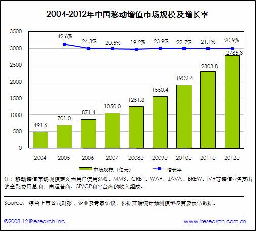根據(jù)iResearch艾瑞咨詢即將推出的《2008-2009年中國(guó)移動(dòng)互聯(lián)網(wǎng)行業(yè)發(fā)展報(bào)告》統(tǒng)計(jì),2008年中國(guó)移動(dòng)增值市場(chǎng)規(guī)模達(dá)1251.3億人民幣(約合183.2億美元),相比2007年的1050億人民幣年同比僅增長(zhǎng)19.2%,相比2007年增速放緩。(中國(guó)移動(dòng)增值市場(chǎng)規(guī)模定義為用戶為各項(xiàng)移動(dòng)增值業(yè)務(wù)付費(fèi)總和)