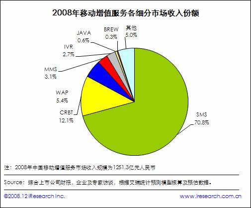 艾瑞研究發(fā)現(xiàn),2008年移動(dòng)增值服務(wù)細(xì)分市場(chǎng)收入中SMS以70.8%的比例占據(jù)主導(dǎo)地位,但其他業(yè)務(wù)對(duì)SMS的分流和替代使其增長(zhǎng)率有所下降;CRBT、WAP分別以12.1%和5.4%的比例位居第二、第三。