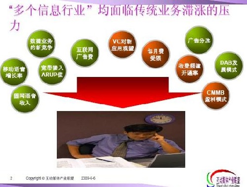 第四,廣電也有它面臨的問(wèn)題,像現(xiàn)在的收視費(fèi)怎么提升,收費(fèi)頻道怎么讓大家接受,CMMB怎樣盈利,廣告被分流等等。