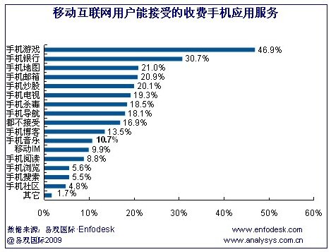 CTI論壇(ctiforum)06月22日消息:據易觀國際(Analysys International)《中國手機應用市場用戶調研報告2009》研究發(fā)現,移動互聯網用戶可接受收費的應用主要是手機游戲和手機銀行/支付,其比例分別為47%和31%,而手機游戲也是移動互聯網用戶使用比例較高的手機應用服務之一。另外,用戶可接受程度較高的還包括手機郵箱、手機導航、手機炒股、手機電視/視頻以及手機殺毒等應用。而移動互聯網用戶對于手機社區(qū)和手機搜索收費的接受度較低。研究發(fā)現,移動互聯網用戶可接受收費的應用主要是手機游戲和手機銀行/支付,其比例分別為47%和31%,而手機游戲也是移動互聯網用戶使用比例較高的手機應用服務之一。另外,用戶可接受程度較高的還包括手機郵箱、手機導航、手機炒股、手機電視/視頻以及手機殺毒等應用。而移動互聯網用戶對于手機社區(qū)和手機搜索收費的接受度較低。