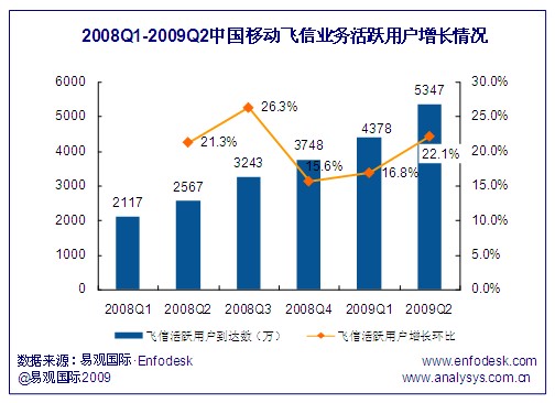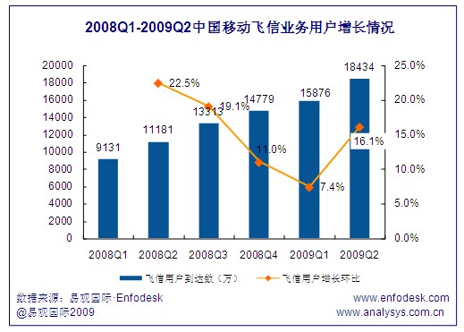 截至2009年第2季度,中國(guó)移動(dòng)飛信用戶到達(dá)數(shù)達(dá)1.84億,環(huán)比增長(zhǎng)16.1%,與2008年第2季度的1.12億用戶到達(dá)數(shù)相比同比增長(zhǎng)64.9%,可見(jiàn)飛信用戶規(guī)模增長(zhǎng)的速度十分迅速,究其原因一方面在于飛信運(yùn)營(yíng)商不遺余力的多渠道營(yíng)銷宣傳,另一方面在于飛信用戶的口碑傳播,由于用戶規(guī)模的增長(zhǎng)帶來(lái)更多用戶嘗試體驗(yàn)飛信業(yè)務(wù)。