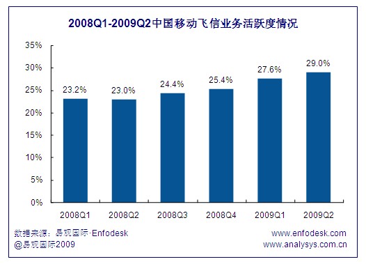 飛信用戶到達(dá)數(shù)的增長(zhǎng)帶來(lái)了活躍用戶的穩(wěn)步提升,截止到2009年第2季度,飛信活躍用戶達(dá)到了5347萬(wàn),與2008年同期相比增長(zhǎng)超過(guò)108.3%。由于一方面飛信到達(dá)數(shù)增長(zhǎng)環(huán)比從2008年第2季度持續(xù)下跌,在2009年第2季度才止跌反彈,相比另一方面飛信活躍用戶的增長(zhǎng)環(huán)比始終保持在15%以上,且從2008年第4季度開(kāi)始飛信活躍用戶增幅持續(xù)擴(kuò)大,因此近期飛信業(yè)務(wù)用戶活躍度表現(xiàn)出良好的增長(zhǎng)勢(shì)頭。