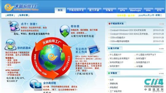 中國電信天翼空間目前已經(jīng)籌備完畢,將于春節(jié)前即2月8日上線。天翼空間將支持Windows Mobile、Windows CE、BREW及Android平臺,目前應用數(shù)已近千個。與App Store等應用商店一樣,天翼空間支持開發(fā)者通過開發(fā)者論壇上傳應用。