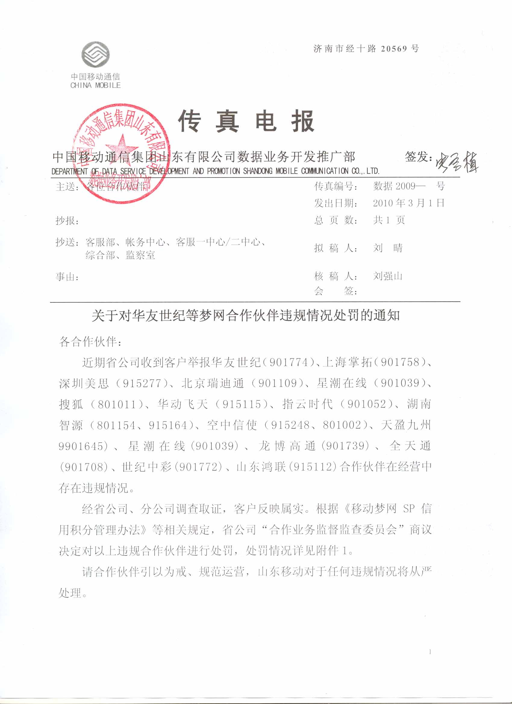 | 15 | 世紀(jì)中彩 | 901772 | 10666873 | 該公司“3D趣味謎語(yǔ)”業(yè)務(wù),使用漢字標(biāo)價(jià),且資費(fèi)提示不明顯。 | 暫停該公司“3D趣味謎語(yǔ)”業(yè)務(wù)(業(yè)務(wù)代碼:CPSDQWMY )在山東地區(qū)的服務(wù)1個(gè)月?鄢庞梅e分8分。 |