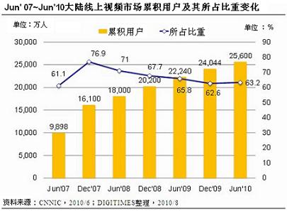 據(jù)中國(guó)互聯(lián)網(wǎng)絡(luò)信息中心(CNNIC)調(diào)查,至2010年6月,中國(guó)在線視頻用戶已達(dá)2.5億,所占比重是4.2億網(wǎng)絡(luò)用戶的63.2%;據(jù)易觀國(guó)際統(tǒng)計(jì),2009年中國(guó)在.線視頻市場(chǎng)規(guī)模達(dá)人民幣8.44億元,較2008年成長(zhǎng)95.4%,其在使用人口及市場(chǎng)規(guī)模表現(xiàn),成為各方爭(zhēng)奪之地。