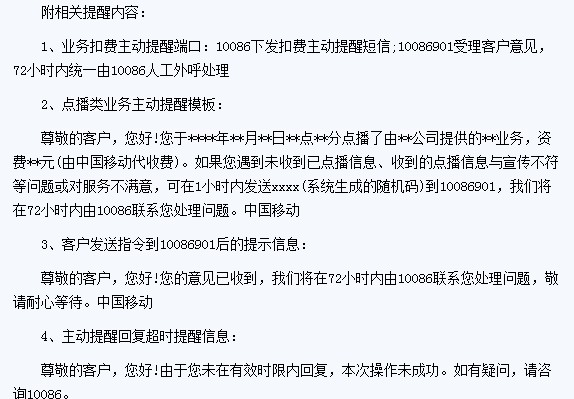 四川移動表示,將于今天完成系統(tǒng)改造和上線點播類業(yè)務的扣費主動提醒功能。為此,四川移動給各大SP廠商下達了通知,并附上了提醒內(nèi)容。從9月1日期,10086對于用戶開通的業(yè)務將會下發(fā)扣費主動提醒短信。此外,中國移動10086901將受理客戶意見,在72小時內(nèi)統(tǒng)一由10086人工外呼處理。對于用戶開通的點播類業(yè)務,中國移動設置了“點播類業(yè)務主動提醒模板”不僅提醒用戶開通了點播類業(yè)務還為用戶點播過程中出現(xiàn)的問題給出了解決途徑。