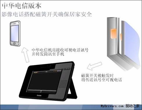 除多媒體服務(wù),AMOR8210內(nèi)建之千里眼服務(wù)更突破業(yè)界標(biāo)準(zhǔn)使其與磁簧開關(guān)整合提供居家安全嶄新服務(wù)。當(dāng)磁簧開關(guān)被觸發(fā)告警時,AMOR8210攝影鏡頭將開啟錄像功能并上傳畫面且同步發(fā)送簡訊至行動電話通知使用者接著使用者可透過3G手機觀看錄像檔案或直接撥接AMOR8210進行實時監(jiān)控。
