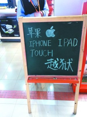 在北京某家樂(lè)福商場(chǎng)外的數(shù)碼店,給iPhone“越獄”的廣告牌格外醒目。