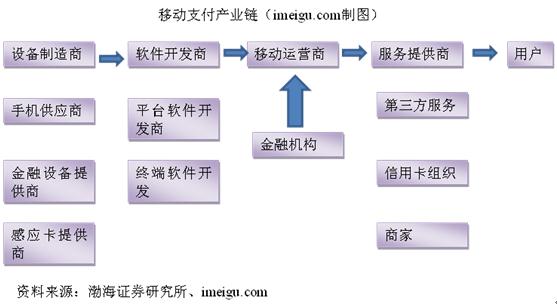 移動支付業(yè)務(wù)產(chǎn)業(yè)鏈主體由設(shè)備制造商、銀行、信用卡組織、移動運(yùn)營商、移動支付服務(wù)提供商(或移動支付平臺運(yùn)營商)、商業(yè)機(jī)構(gòu)、SIM卡供應(yīng)商、手機(jī)供應(yīng)商、用戶等多個環(huán)節(jié)組成。