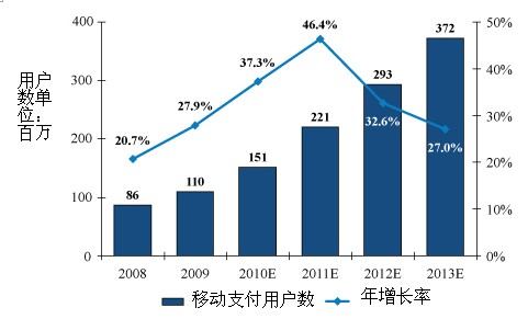 基于“中國計(jì)算機(jī)世界”的研究預(yù)測,中國移動支付用戶在2009年底達(dá)到1.1億,預(yù)計(jì)將在2013年超過3倍。由于需求大幅提高,電信運(yùn)營商會繼續(xù)在每個省推出移動支付解決方案網(wǎng)絡(luò)。反過來,也會刺激第三方平臺和供應(yīng)商的發(fā)展。