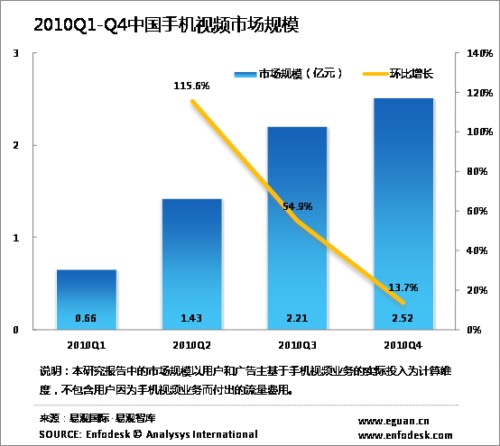 根據(jù)Enfodesk易觀智庫近期發(fā)布數(shù)據(jù)顯示,2010年中國手機視頻市場規(guī)模達(dá)到6.81億元。