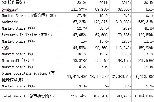 預(yù)計(jì)到2011年底,Android系統(tǒng)將在全球操作系統(tǒng)市場中占據(jù)38.5%的份額,超過Symbian系統(tǒng),預(yù)計(jì)Symbian將達(dá)到19.2%的市場份額。蘋果的iOS系統(tǒng)將在2011年成為第二大受歡迎的操作系統(tǒng),占據(jù)19.4%的市場份額,位列第三位的是 RIM (13.4%),第四位是微軟 WP(5.6%)。