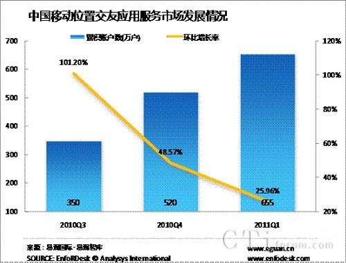 2011年Q1中國移動位置交友應用累計帳戶數(shù)達655萬
