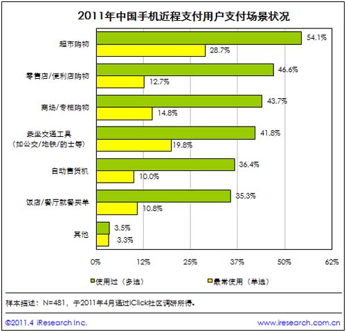 根據(jù)艾瑞咨詢近期發(fā)布的《2011年中國新興線下支付行業(yè)研究報(bào)告》的研究數(shù)據(jù)顯示,中國手機(jī)支付發(fā)生的場景主要集中在超市、便利店和商場等場所;并且,目前的中國用戶的手機(jī)支付金額,都以100元及以下的小額支付為主。