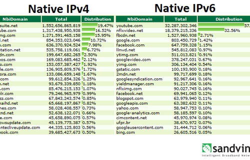 根據(jù)Sandvine的采樣數(shù)據(jù),YouTube服務(wù)貢獻了最多的IPv6流量,約為57%。緊接著是Netflix,流量貢獻約為32%。Facebook及其內(nèi)容分發(fā)網(wǎng)絡(luò)分別貢獻了1.15%和2.7%的流量,谷歌主頁則貢獻了1.42%的流量。(盧鑫)