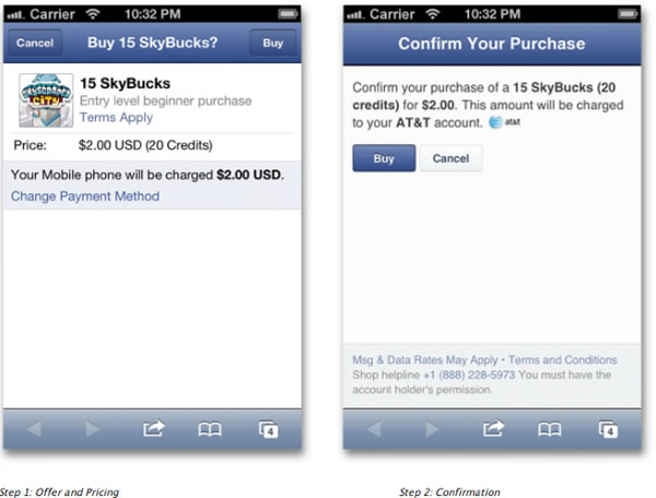現(xiàn)在,針對(duì)應(yīng)用內(nèi)支付,F(xiàn)acebook聯(lián)合移動(dòng)運(yùn)營商推出了便捷的支付服務(wù),允許用戶在購買Facebook應(yīng)用開發(fā)商所提供的服務(wù)、游戲或者升級(jí)服務(wù)時(shí),直接將交易費(fèi)記到電話賬單當(dāng)中。整個(gè)流程被簡化成2步:首先用戶選擇需要購買的服務(wù),然后打開支付窗口,點(diǎn)擊確認(rèn)即可。