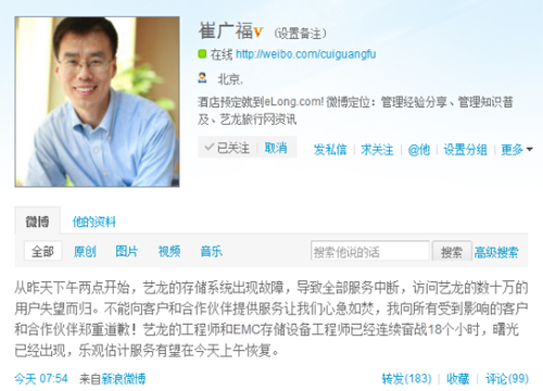 7月12日上午消息,因遭遇存儲故障,從昨日下午2時起,提供在線服務(wù)的旅游網(wǎng)站藝龍開始無法訪問,截至目前已經(jīng)過去了20個小時。藝龍CEO崔廣福通過新浪微博表示,藝龍工程師和EMC存儲工程師正在緊張搶修中,預(yù)計今天上午能夠恢復正常。新浪科技