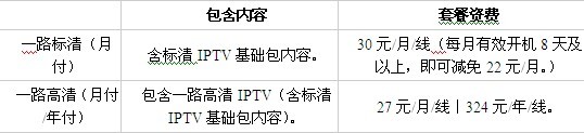在IPTV的推廣上,江蘇電信也采取了和現(xiàn)有E家套餐捆綁的方式進(jìn)行推廣。現(xiàn)已推出高清IPTV服務(wù)。具體費(fèi)用見(jiàn)下表: