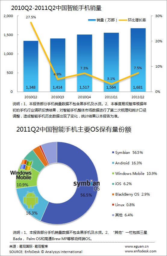 CTI論壇(ctiforum)4月29日消息(記者 潘婷婷):根據(jù)易觀智庫(kù)EnfoDesk近期發(fā)布數(shù)據(jù)顯示,中國(guó)智能手機(jī)市場(chǎng)2011年第2季度國(guó)內(nèi)銷(xiāo)售總量達(dá)1681萬(wàn)部(不計(jì)黑手機(jī)和水貨手機(jī)),環(huán)比增長(zhǎng)7.5%。
