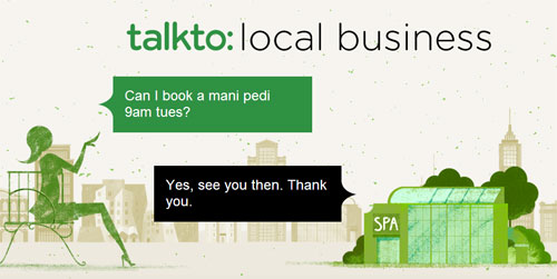 這一切是怎樣實(shí)現(xiàn)的呢?TalkTo通過(guò)短信與商家溝通。用戶可以通過(guò)web應(yīng)用在TalkTo目錄中搜索需要的服務(wù),輸入商家的詳細(xì)地址或者大概位置,TalkTo就可以確保商家看到用戶的短信。TalkTo用戶可以向商家提出問(wèn)題和意見(jiàn),或直接預(yù)定服務(wù)!斑@一切就像和朋友發(fā)短信一樣簡(jiǎn)單!