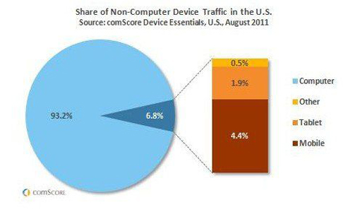 市場(chǎng)研究公司comScore發(fā)表報(bào)告稱,8月份,智能手機(jī)和平板電腦等“非計(jì)算機(jī)”設(shè)備在美國(guó)互聯(lián)網(wǎng)流量中的份額由6月底時(shí)的6.2%增長(zhǎng)至6.8%。