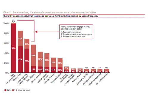 將近一半或一半以上的用戶每天都使用三大功能:基本的通信功能;獲取新聞天氣體育等信息,以及使用社交網(wǎng)絡