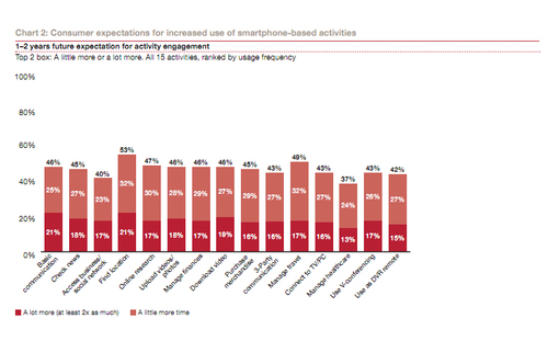 而在未來兩年,這些不同的功能使用只會越來越多,像基本的通信功能、LBS等,21%的用戶預計使用的程度將是今天的2倍以上